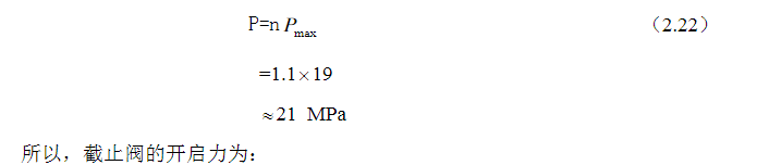 因為,液壓系統設計的最高壓力為∶Pn-=19MPa 取,截止閥的開啟系數為∶n=1.1 所以,截止閥的開啟壓力為∶